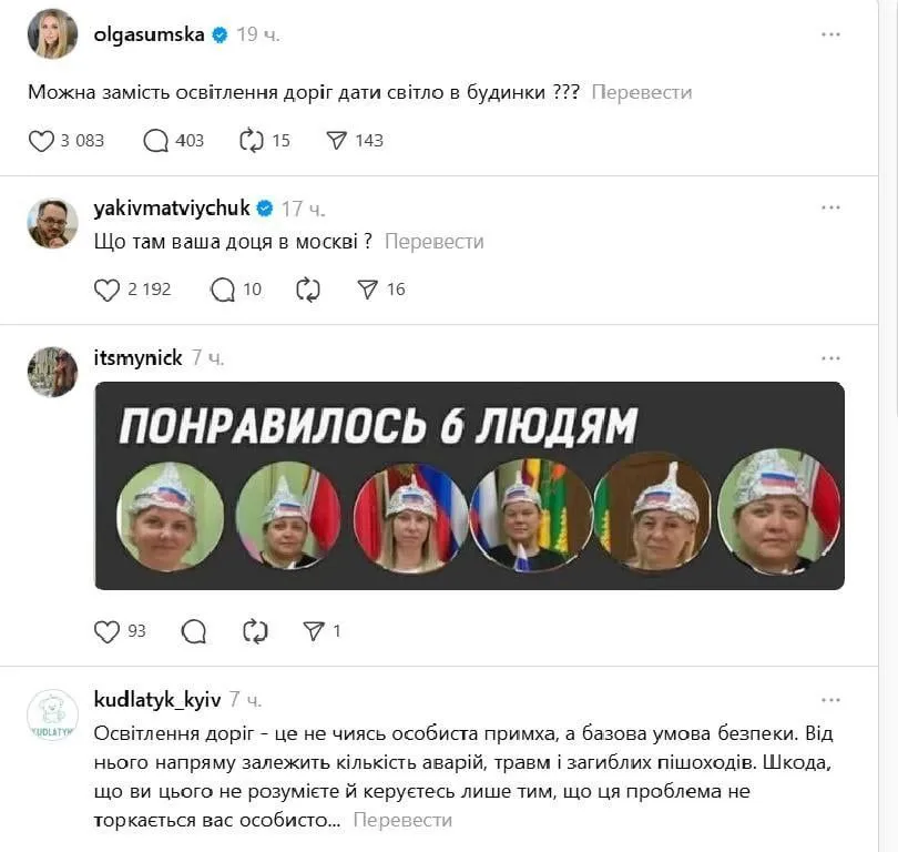 На своїй сторінці артистка висловила думку, що замість освітлення вулиць варто забезпечити світло в будинках.