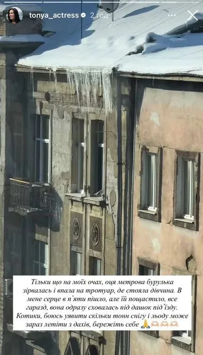 Українська акторка Антоніна Хижняк, яку глядачі знають як Мотрю з серіалу «Спіймати Кайдаша», шокувала історією про небезпечний інцидент у Львові. За словами артистки, вона стала свідком того, як на випадкову перехожу ледь не впала велика брила льоду з даху будинку. Про це вона розповіла в Instagram.