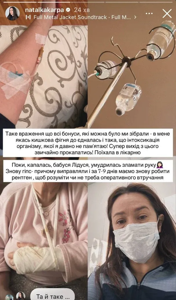 Проте на цьому труднощі для сім'ї не закінчилися. Поки Наталка перебувала під крапельницями, у її мами стався нещасний випадок — жінка зламала руку й опинилася з гіпсом. Співачка повідомила, що за сім-дев'ять днів потрібно зробити рентген, аби з'ясувати, чи не знадобиться оперативне втручання.