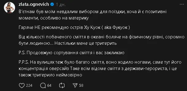 Окремо Огнєвіч зачепила тема екології. Вона розповіла, що на пляжах та в океані побачила величезну кількість відходів, і це вразило її значно сильніше, ніж поведінка туристів.