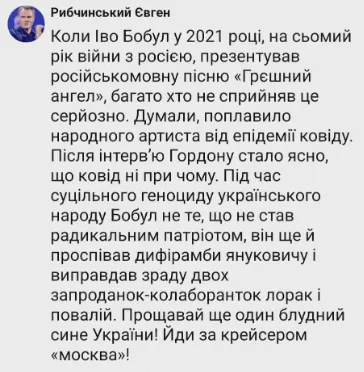 У своєму дописі Євген Рибчинський різко висловився щодо позиції Іво Бобула та його заяв про артисток, які працюють у країні-агресорі. Поет не добирав слів, оцінюючи дії колег по сцені.