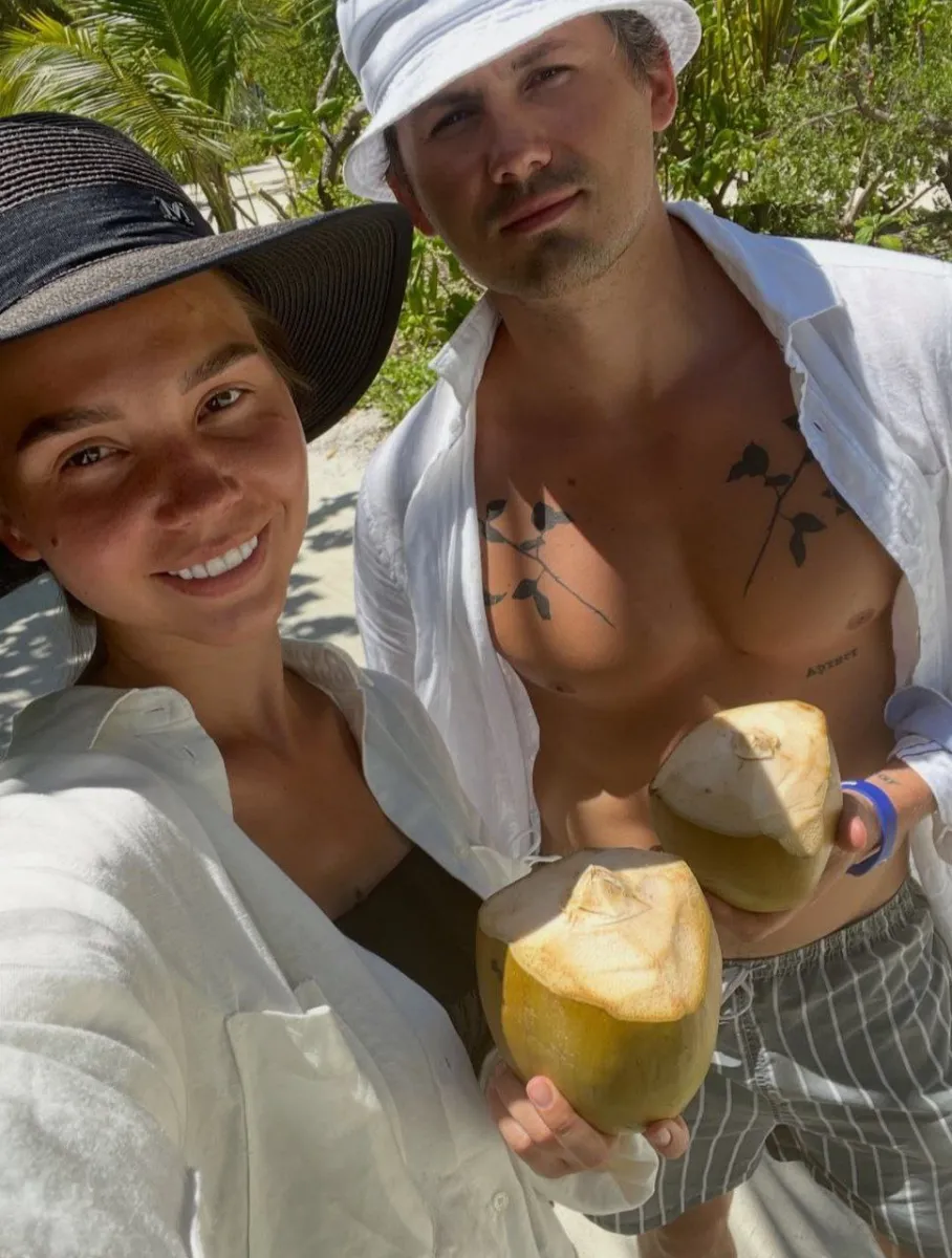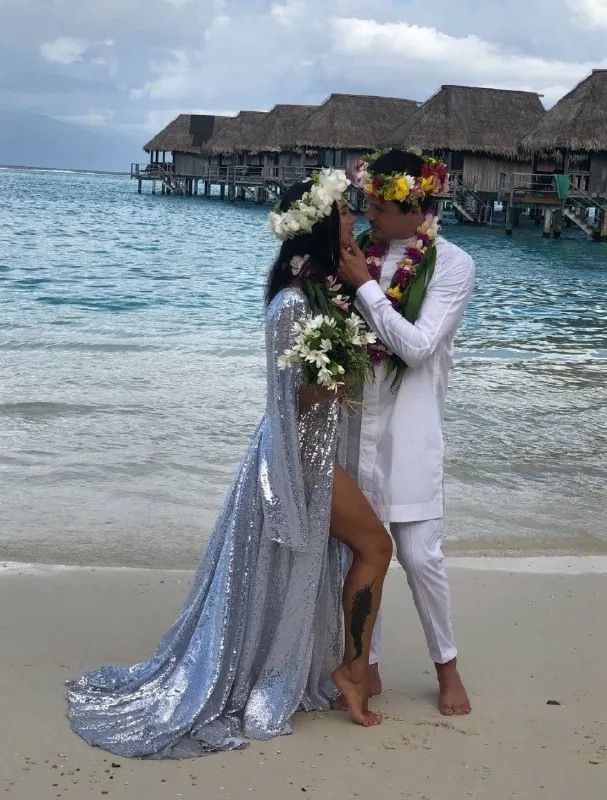 Особливий фурор викликав кадр із їхнього екзотичного весілля на острові Таїті. На фото пара позує у святковому образі: Наталія у блискучій сукні, Женя у білому костюмі. Фінальним штрихом стали традиційні вінки та масивні намиста зі свіжих квітів.