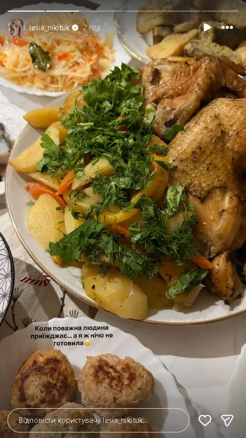 Саме після його приїзду, судячи з усього, Леся і виклала попереднє сторіс із накритим столом та жартівливим підписом про «поважну людину». Тож страви, які зірка показала раніше, найімовірніше були приготовані саме для нього.