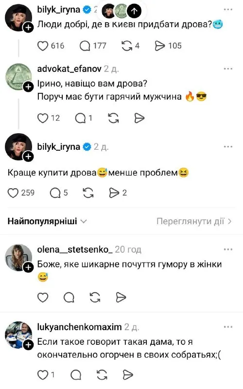 Як відомо, Білик вирішила бути ближчою до фоловерів і опублікувала допис у популярній соцмережі Threads, де попросила порадити кілька варіантів, де можна придбати дрова в Києві.