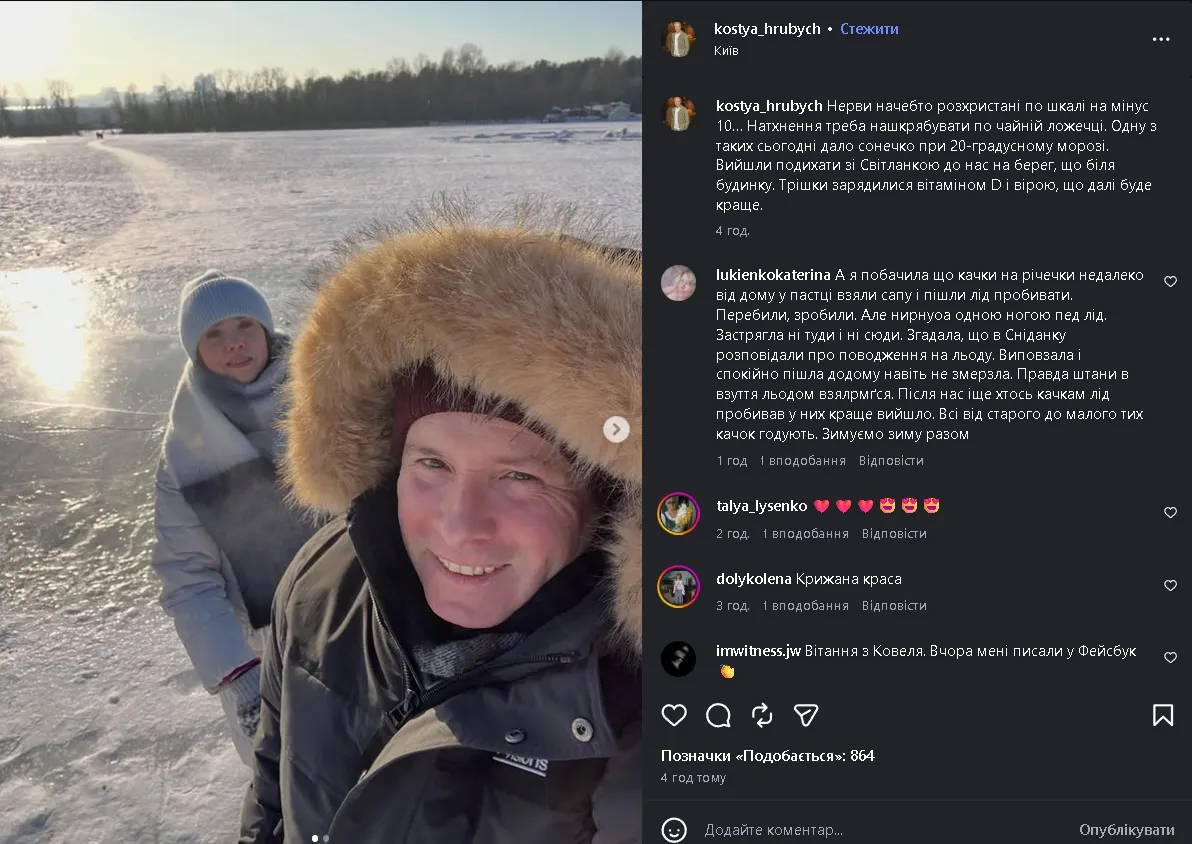 Український журналіст і телеведучий Костянтин Грубич показав рідкісний кадр із дружиною Світланою. Подружжя влаштувало неспішну прогулянку на замерзлій водоймі біля власного будинку, насолоджуючись сонячним днем при 20‑градусному морозі.