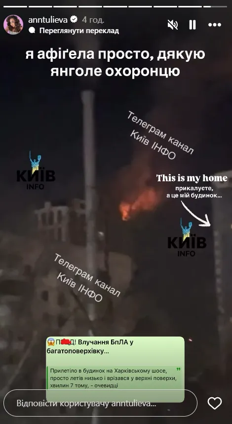Ведуча препаті і eurofans-зони Нацвідбору на Євробачення-2026 живе на лівому березі Києва в одному з висотних житлових комплексів. В сторіз свого Instagram Тульєва опублікувала відео з одного Telegram-пабліків, на якому видно пожежу в одній з багатоповерхівок. Стрілкою Анна показала свій будинок, який знаходиться поруч.