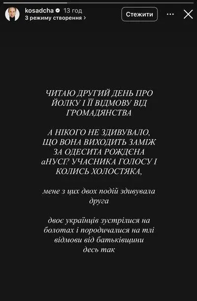 «Читаю другий день про Йолку і її відмову від громадянства. Але найбільше мене здивувало інше – те, що вона виходить заміж за одесита Рождєна Анусі – учасника “Голосу” і колишнього Холостяка. Двоє українців зустрілися на болотах і породичалися на тлі відмови від Батьківщини», – зазначила ведуча.
