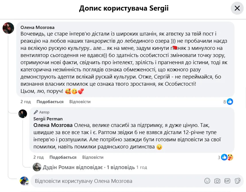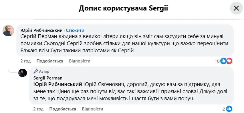«Сергій Перман людина з великої літери, якщо він зміг сам засудити себе за минулі помилки. Сьогодні Сергій зробив стільки для нашої культури, що важко переоцінити. Бажаю всім бути такими патріотами, як Сергій», – написав 80-річний Юрій Рибчинський.
