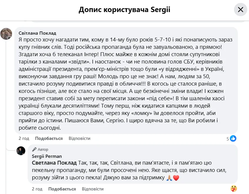 «Перш ніж кидатися капцями в людей старшого віку, просто подумайте, через яку «ломку» їм довелося пройти, аби прийти до істини. Пишаюся вами, Сергію. І щиро вдячна за те, що ви робили і робите сьогодні», – написала Світлана Поклад.