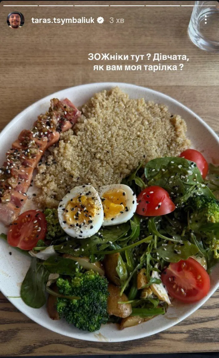 Зірка поділився фото своєї тарілки з їжею, продемонструвавши фанатам, що входить до його щоденного меню. На тарілці Цимбалюка можна побачити ячмінну кашу, багату на клітковину, вітаміни групи B, PP та E, а також мінерали – калій, магній, залізо й цинк. Доповнив страву невеликий шматочок червоної риби з кунжутом та варене яйце.