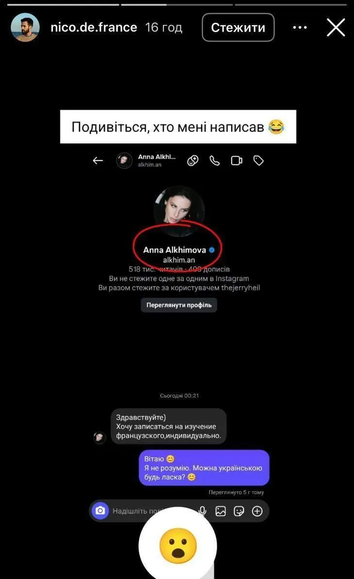 Чоловік опублікував скриншот листування, у якому Алхім звернулася до нього російською мовою, намагаючись домовитися про уроки французької. У відповідь Ніколас написав: «Я не розумію. Можна українською, будь ласка?». Блогерка повідомлення прочитала, однак мову спілкування так і не змінила – на цьому «навчання» завершилося.