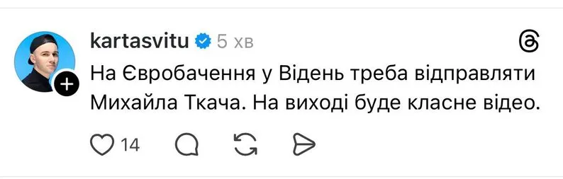 Іван Марунич із гурту Kartasvitu вважає доречним відправити до Відня Михайла Ткача. Відео точно стане вірусним, але, як правило, багато людей поруч із журналістом виглядають, неначе паралізовані.