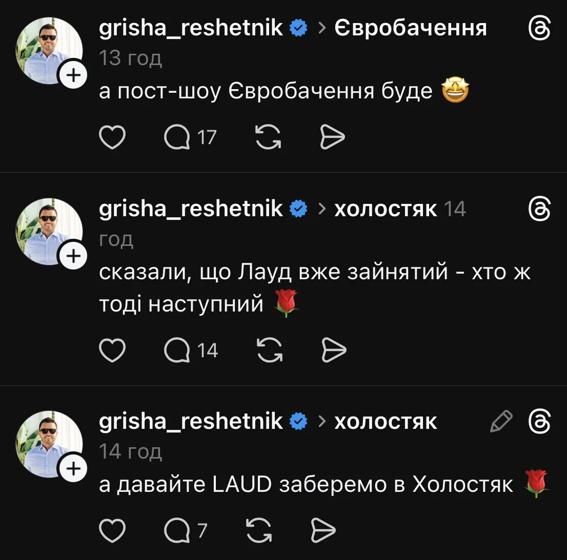 Далі Решетнік, у продовження атмосфери гумору в своїх дописах, зазначив, що «ми усі починалися з Лелеки» та жартома запитав, чи очікувати на пост-шоу Євробачення.