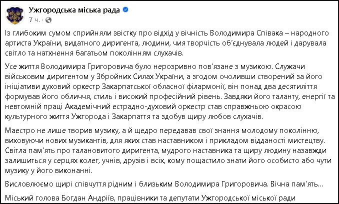 Ужгородська міська рада повідомила про смерть народного артиста України Володимира Співака. Видатний диригент пішов із життя 8 лютого у віці 67 років – причина смерті наразі не розголошується.