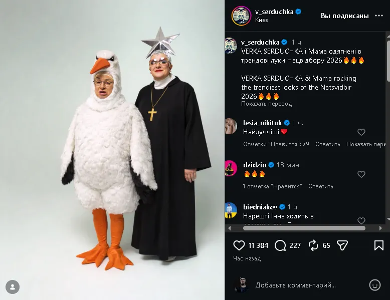 Андрій Данилко потішив підписників новим фото в образі Вєрки Сердючки. У своєму Instagram артист опублікував кумедний кадр, де Сєрдючка та Мама з’являються у яскравих костюмах, які він жартома назвав «трендовими луками Нацвідбору 2026».