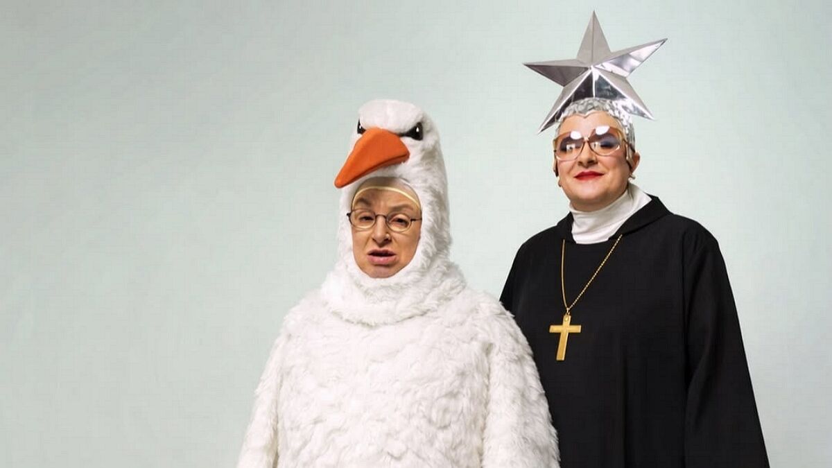 На світлині Вєрка позує у впізнаваному сценічному стилі – зірковий головний убір, масивний хрест і чорний образ із білим коміром створюють ефект театральної іронії. Поруч Мама у костюмі лелеки, що додає фото ще більшої абсурдності та фірмового гумору.