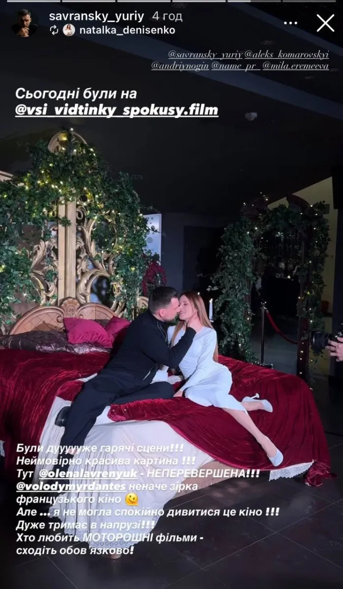 Акторка Наталка Денисенко та її коханий Юрій Савранський відвідали прем'єру першого українського еротичного трилера «Всі відтінки спокуси». У головних ролях виступили Володимир Дантес та Олена Лавренюк. Цим артистка поділилась у мережі Instagram.