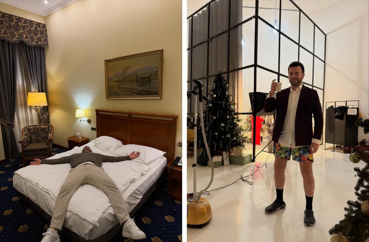 На одному зі знімків він лежить на ліжку, розкинувши руки, ніби демонструючи повну зимову апатію, змішану з бажанням відпочити. Такий образ вийшов не постановочним, а радше побутовим – тим, який легко впізнати у власних зимових днях.