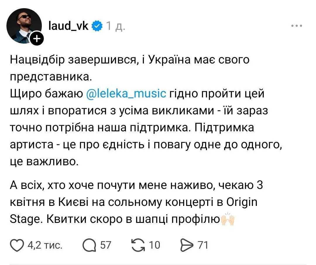 «Нацвідбір завершився і Україна має свого представника. Щиро бажаю Lelѐka гідно пройти цей шлях і впоратися з усіма викликами – їй зараз точно потрібна наша підтримка», – написав артист.