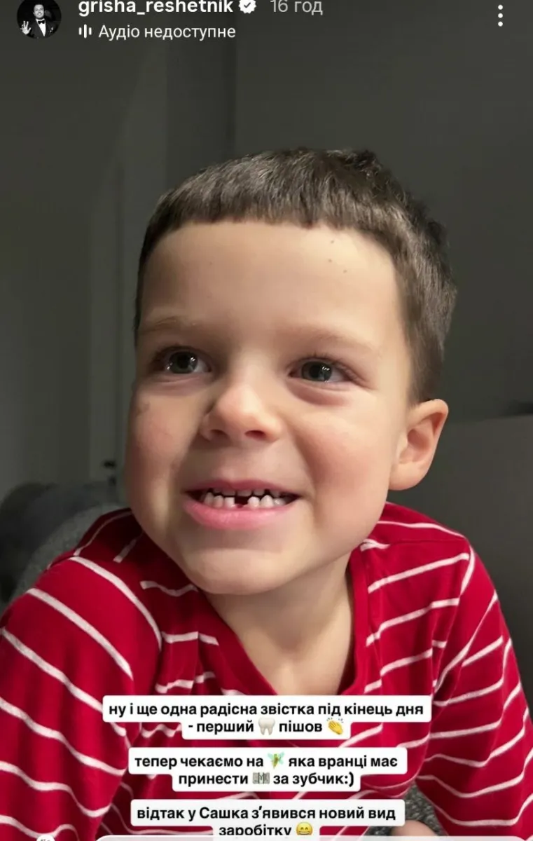«Ну і ще одна радісна звістка під кінець дня – перший зуб пішов. Тепер чекаємо на фею, яка вранці має принести гроші за зубчик. Відтак у Сашка з'явився новий вид заробітку», – написав Решетнік в Instagram.