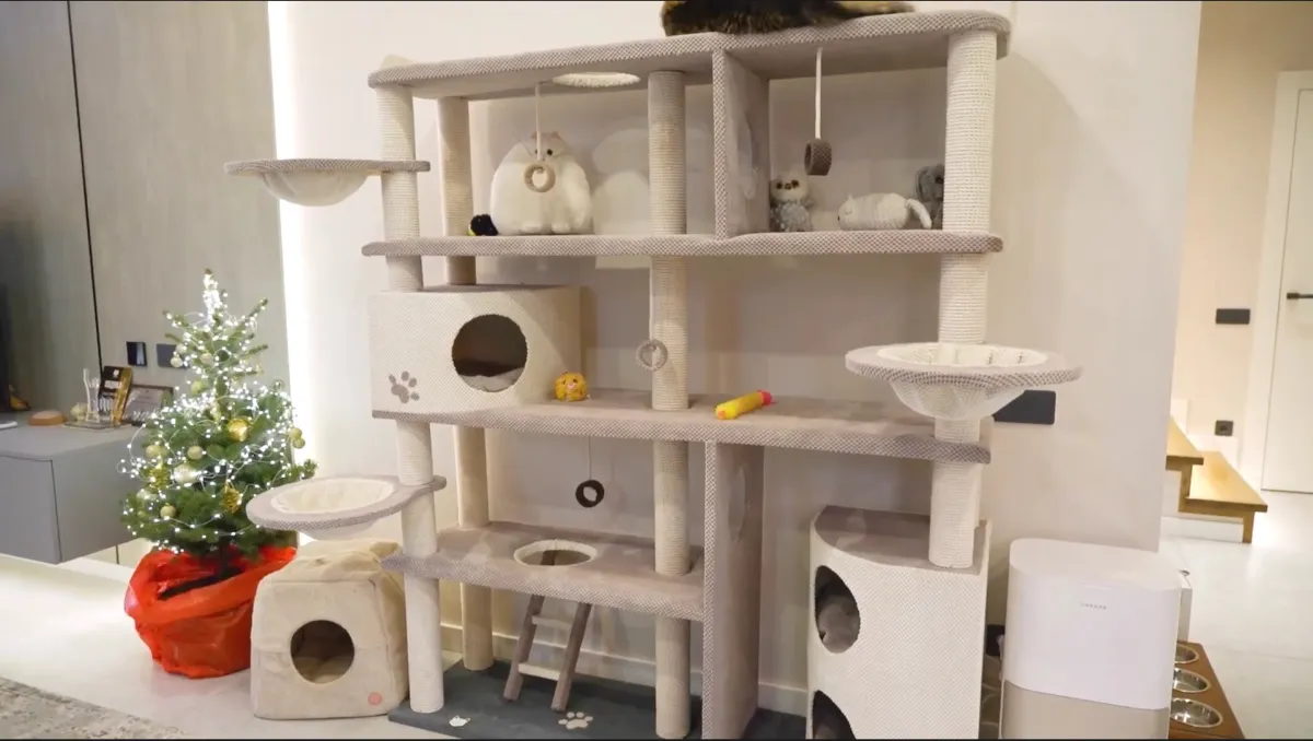 На першому поверсі розташовані вітальня, кухня, гостьова ванна та окрема зона, яку жартома називають «готелем» для котів.