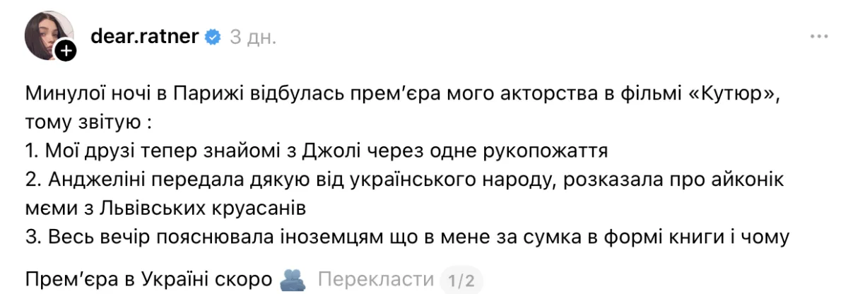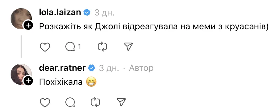 У коментарях поцікавилися як Анджеліна Джолі відреагувала на меми з «Львівських круасанів», на що Ратнер відповіла, що голлівудська зірка сприйняла це з гумором.