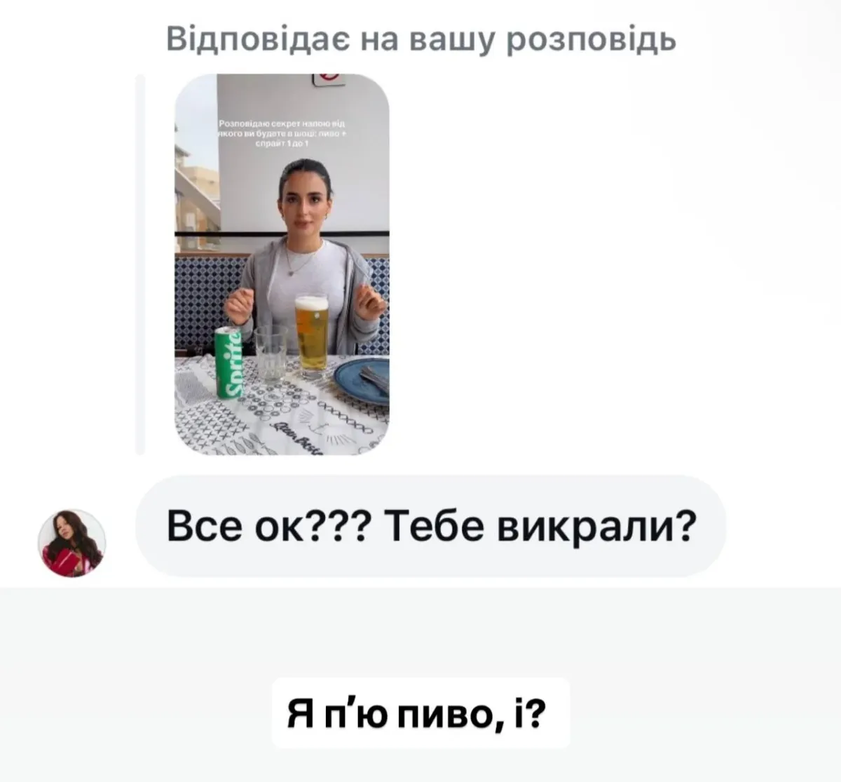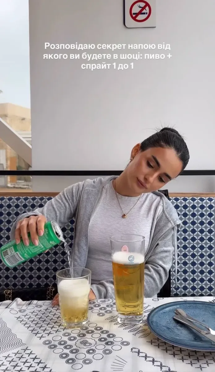 «Зараз буде мій фірмовий напій. Розумію, що пиво зі мною не дуже асоціюється, але просто спробуйте. Пиво + спрайт 1 до 1», — порадила вона своїм підписникам.