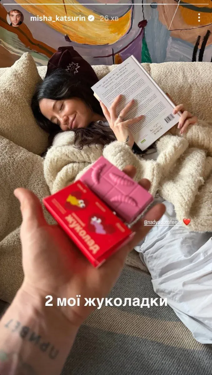 Михайло Кацурін опублікував рідкісні домашні кадри з Надею. Ресторатор показав артистку в максимально розслабленій атмосфері: без макіяжу, з книгою в руках та загорнуту в ковдру. Святковий настрій у кадрі доповнили рожеві солодощі до Дня закоханих, а сам Михайло супроводив публікацію ніжним зверненням до дружини.