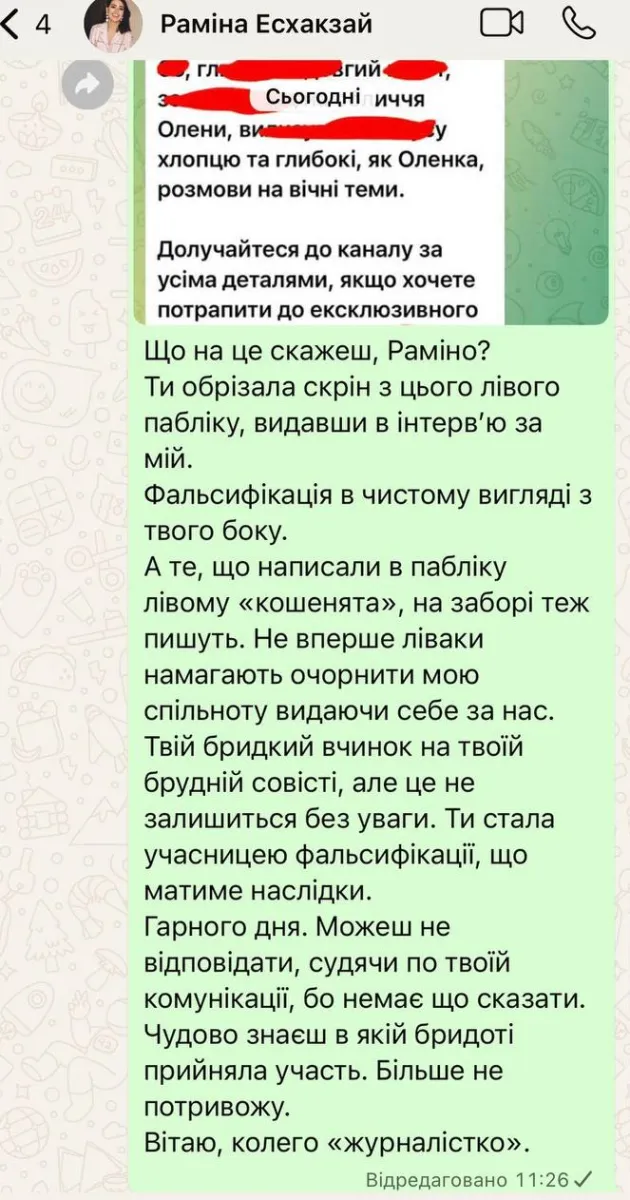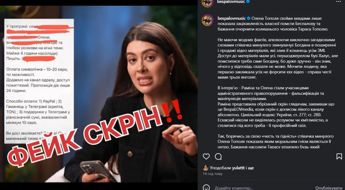 «Фальсифікація та маніпуляція матеріалами. Раміна представила обрізаний скрін глядачам, заявивши що це BespaLOVmedia, коли скрін є дописом лівого каналу абсолютно. Цивільний кодекс України, ст. 277; ст. 280. Есхакзай ніколи не виділялась розумом чи кмітливістю, а стелитися під кого треба – її професійний скіл», – йдеться в дописі Беспалова.