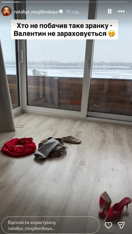 Артистка опублікувала світлину, на якій показала розкидані речі – ймовірно, свої та коханого – після романтично проведеного вечора. Наталія жартівливо зазначила, що якщо підписники не побачили подібного у себе, то Валентин до них не завітав.