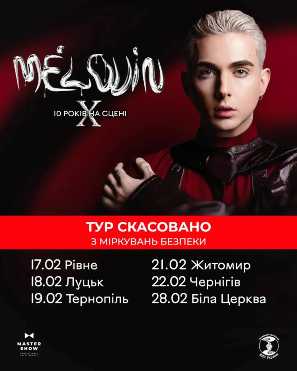 Український співак MELOVIN не поїде з концертами містами України після інциденту в Рівному, де його виступ зірвали невідомі. Про скасування туру повідомила команда Master Show в Instagram. У заяві зазначено, що концерти в Луцьку, Тернополі, Житомирі, Чернігові та Білій Церкві не відбудуться з міркувань безпеки.