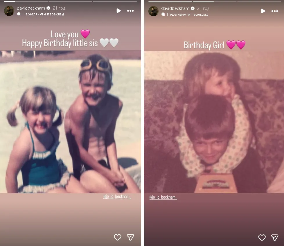 50‑річний Девід Бекхем опублікував у своєму Instagram серію архівних сімейних фото, вітаючи молодшу сестру Джоанн із 44‑річчям.