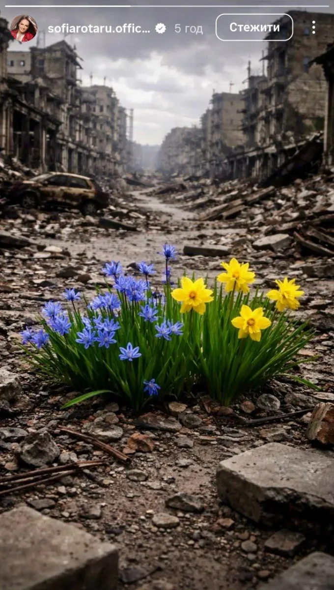 Ротару опублікувала світлину, на якій зафіксовано зруйноване місто й обгорілу автівку. На тлі сірого, апокаліптичного пейзажу на згарищі проросли квіти кольорів українського прапора – блакитні проліски та жовті нарциси.