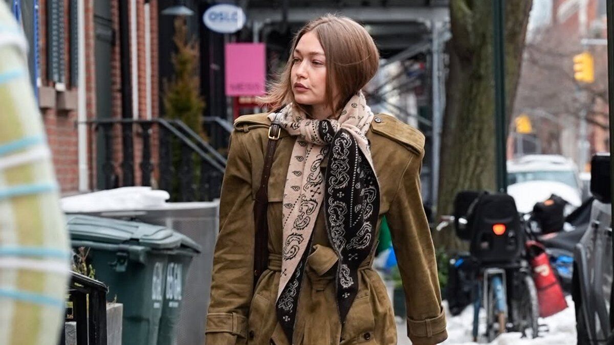 Стиль Джіджі будується на простих речах і чітких силуетах. Денім створює базу, лофери додають елегантності, а замшевий тренч формує структуру. Бандана як шарф завершує образ і робить його актуальним, доводячи, що недорогий аксесуар може стати головною деталлю сезону.