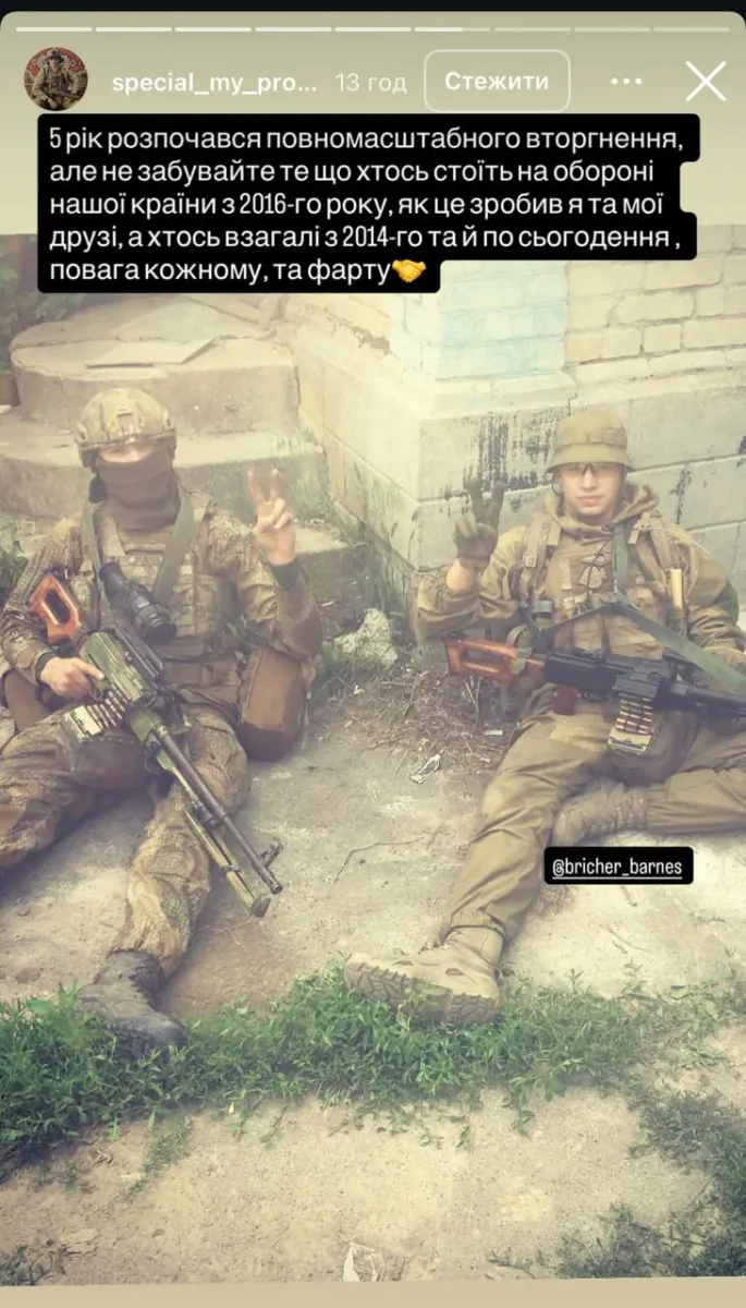 «Почався 5 рік повномасштабного вторгнення, але не забувайте, що хтось стоїть на обороні нашої країни з 2016 року, як це зробили я і мої друзі, а хтось — взагалі з 2014 року і до теперішнього часу. Повага кожному і фарту»