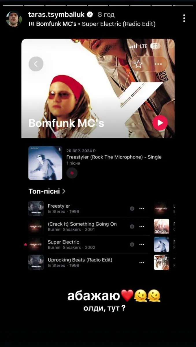 У своїх Stories Тарас опублікував скріншот свого плейлиста від легендарного фінського гурту Bomfunk MC's. Актор зізнався у любові до треків, які були справжніми хітами на початку 2000-х, окремо відзначивши композицію «Super Electric».