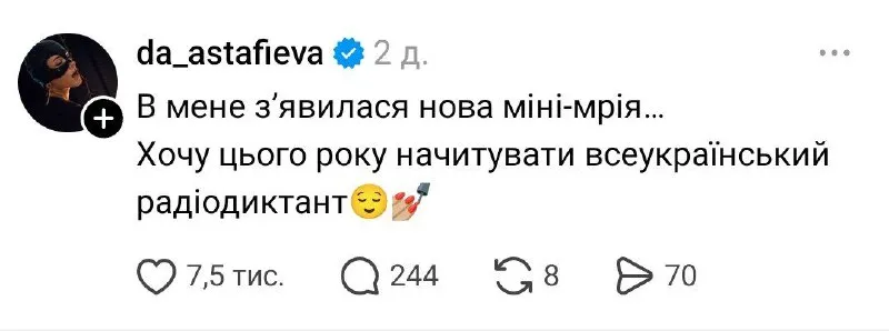 «В мене зʼявилася нова міні-мрія… Хочу цього року начитувати всеукраїнський радіодиктант», – написала Астаф’єва.