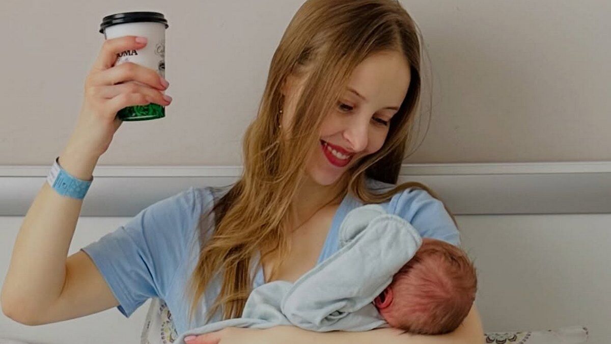 Тепер вже мама трьох дітей показала фотографію з немовлям на ліжку: 36-річна акторка посміхається із маленьким сином на руках, а також тримає в руці каву.