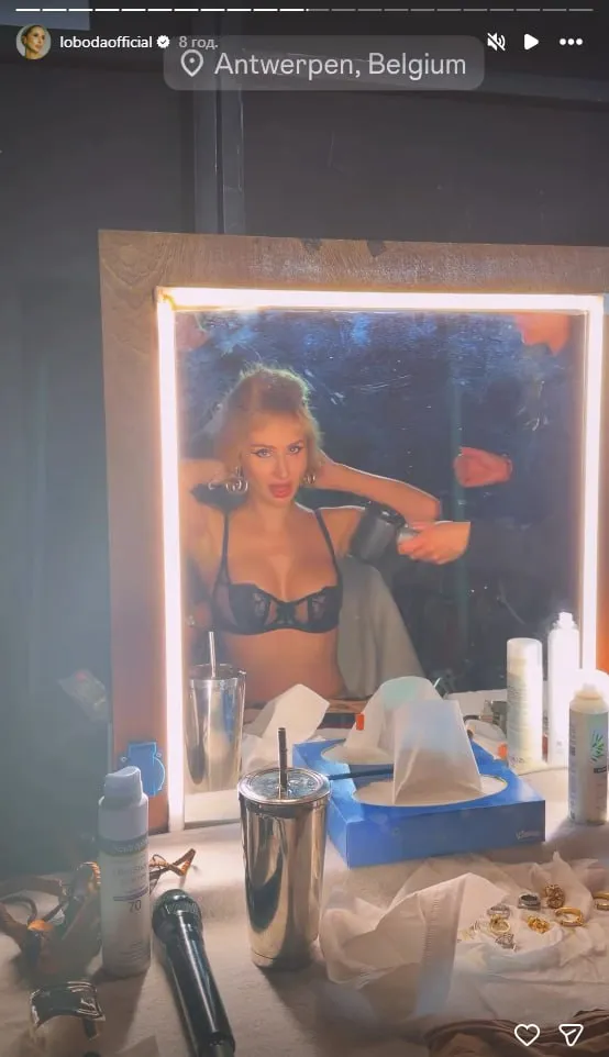 На знімку Лобода позує перед дзеркалом з підсвіткою у мереживному чорному бюстгальтері. Навколо знаходиться типова передконцертна атмосфера: косметика, прикраси, термос і мікрофон на столику. На фото зазначена геолокація «Антверпен, Бельгія».