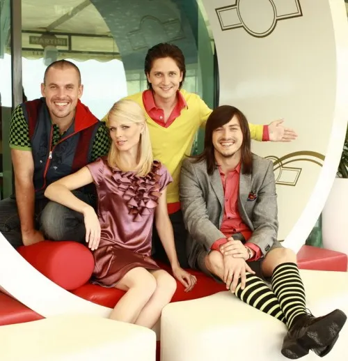 Сергій Притула, Олександр Педан, Геннадій Попенко та Ольга Фреймут вестимуть програму «Підйом». Фото: Новий канал(2008)