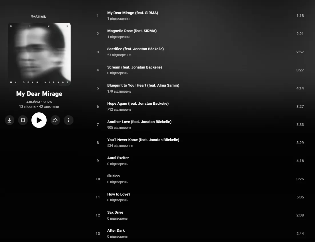 Альбом My Dear Mirage онука Софії Ротару, який виступає під псевдонімом SHMN. Скриншот: YouTube Music