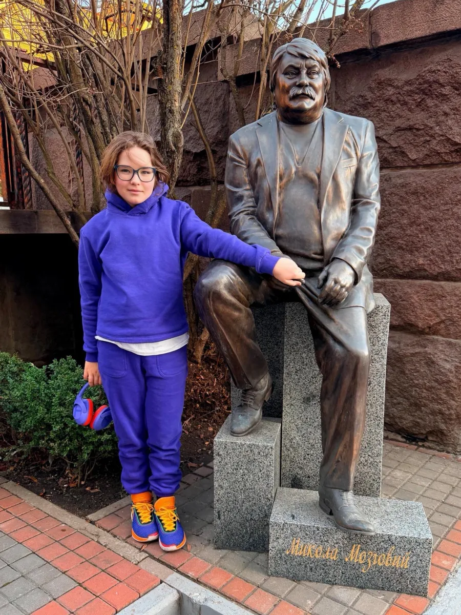 На світлині дівчинка стоїть біля пам’ятника її легендарному дідусеві — відомому українському співакові та композитору Миколі Мозговому.