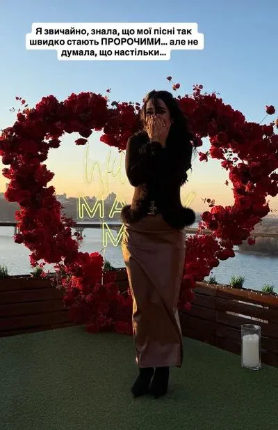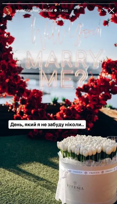 На світлинах у сторіс Трінчер з'явилася на гарній галявині, що прикрашена серцем з квітів, а посередині написана фраза, яку хоче почути кожна дівчина «Ти вийдеш за мене заміж?». Сама Анна щасливо стоїть з приголомшеним виразом обличчя.