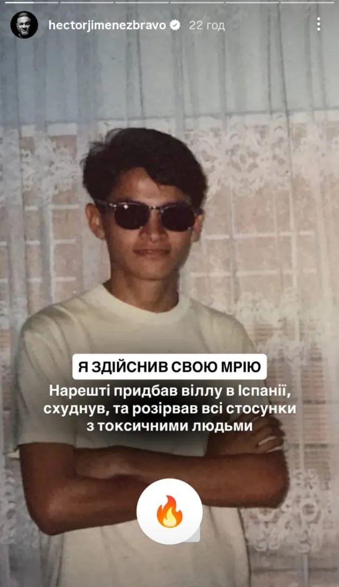 На архівних світлинах Ектора не впізнати: він постав у темних окулярах та з розкішним темним волоссям. Ектор жартома зазначив, що здійснив свою мрію та придбав не тільки нерухомість в Іспанії, але й розірвав всі стосунки з токсичними людьми.