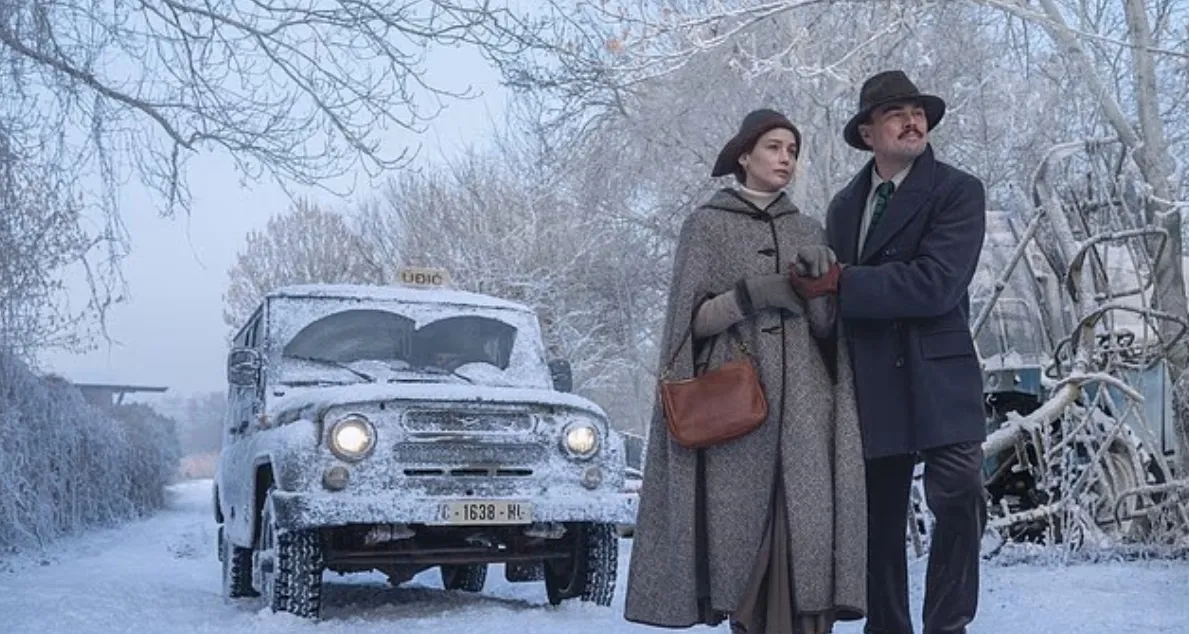 Актор відростив густі вуса, затемнив волосся та перейшов на ретро‑образ – пальто, капелюх, зимовий антураж.