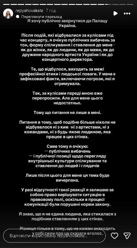 Палац «Україна» вже відреагував на ситуацію. В установі підтвердили конфлікт і назвали поведінку продюсера концерту неприпустимою, наголосивши, що жодні обставини не виправдовують подібного ставлення до жінки. Катерині Репяховій публічно вибачилися.