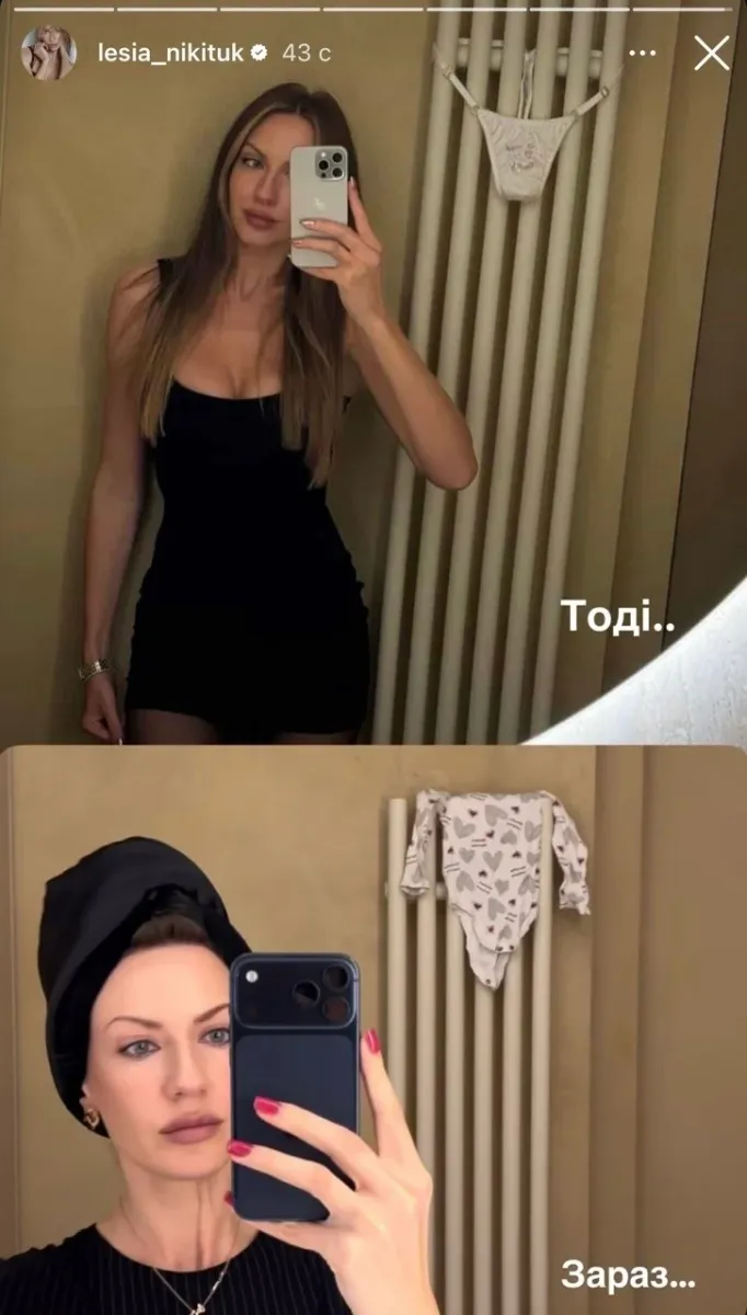 На другій світлині Леся з'явилася вже у звичному для матусь образі, що нічого не встигають та з рушником на голові. Ймовірно, що зірка робила декілька справ одразу: готувала їсти, заспокоювала сина і паралельно збиралася на роботу. Замість сексуальної білизни на батареї тепер сохне дитячий боді. Сама Нікітюк називає це своєю трансформацією до та після.