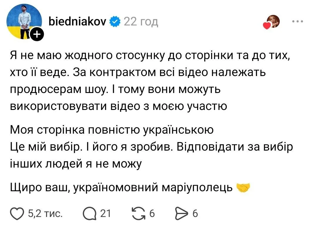 Колишній телеведучий популярного шоу Андрій Бєдняков не пройшов повз та гостро висловився у коментарях. Він зазначив, що не має жодного стосунку до нового проєкту російською мовою та написав, що свої соцмережі веде виключно українською.