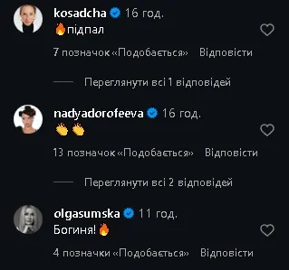Під постом з’явилися сотні коментарів підтримки. Українські зірки – Катя Осадча, Надя Дорофєєва, Ольга Сумська – залишили емоційні реакції та компліменти.