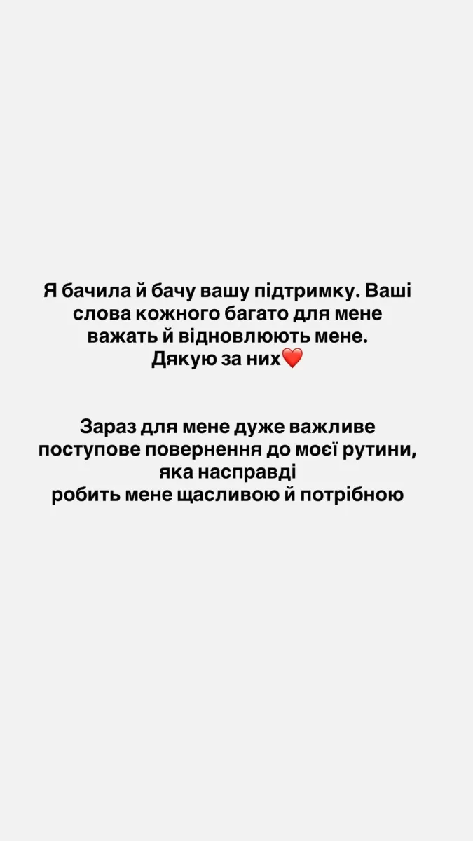 Дівчина подякувала всім, хто підтримував її делікатно та без зайвих слів. Вона наголосила, що зараз зосереджена на власному відновленні.